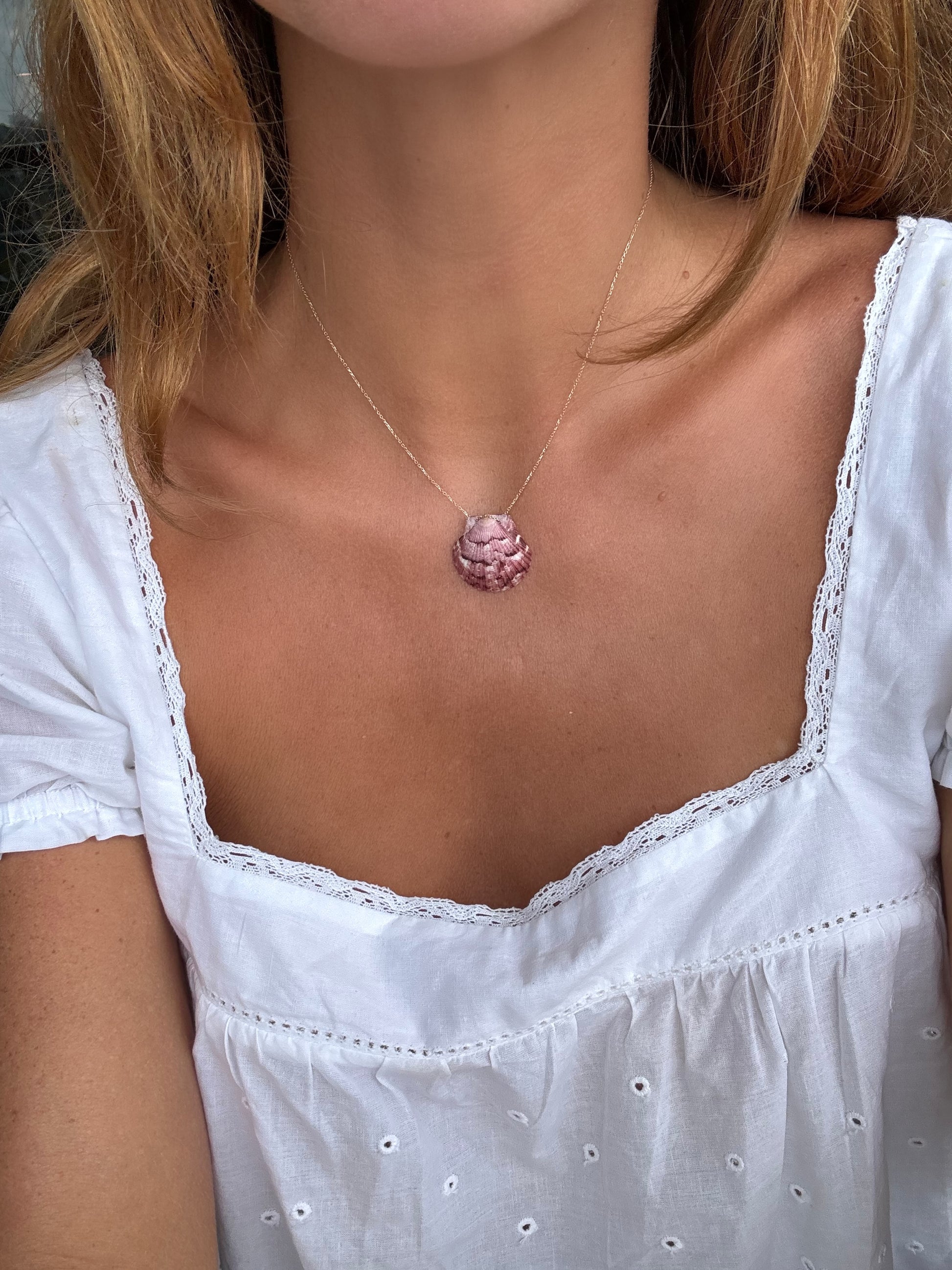 small dark pink scallop shell on a dainty but solid 14k gold chain.