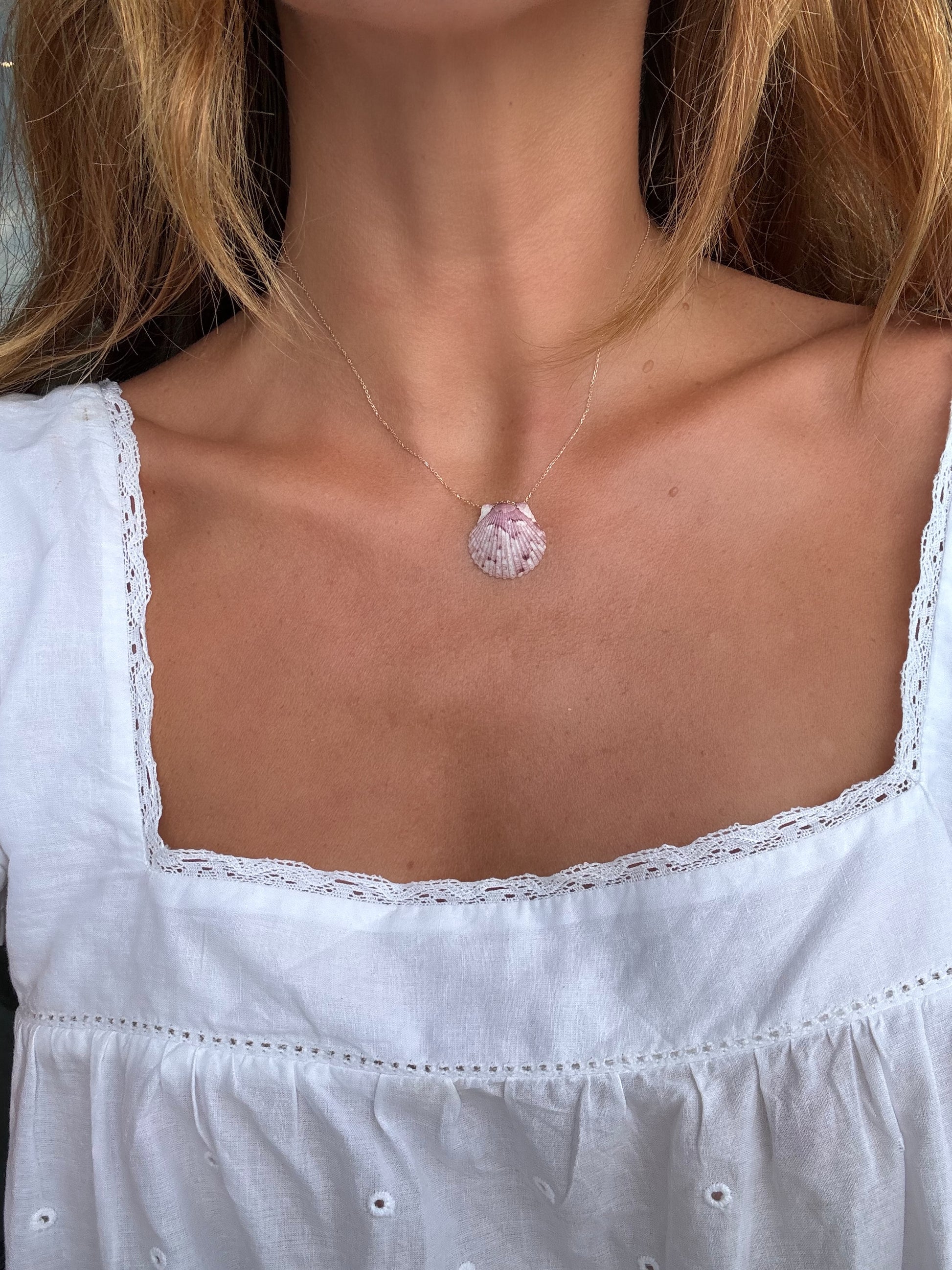 small pink scallop shell on a dainty but solid 14k gold chain.