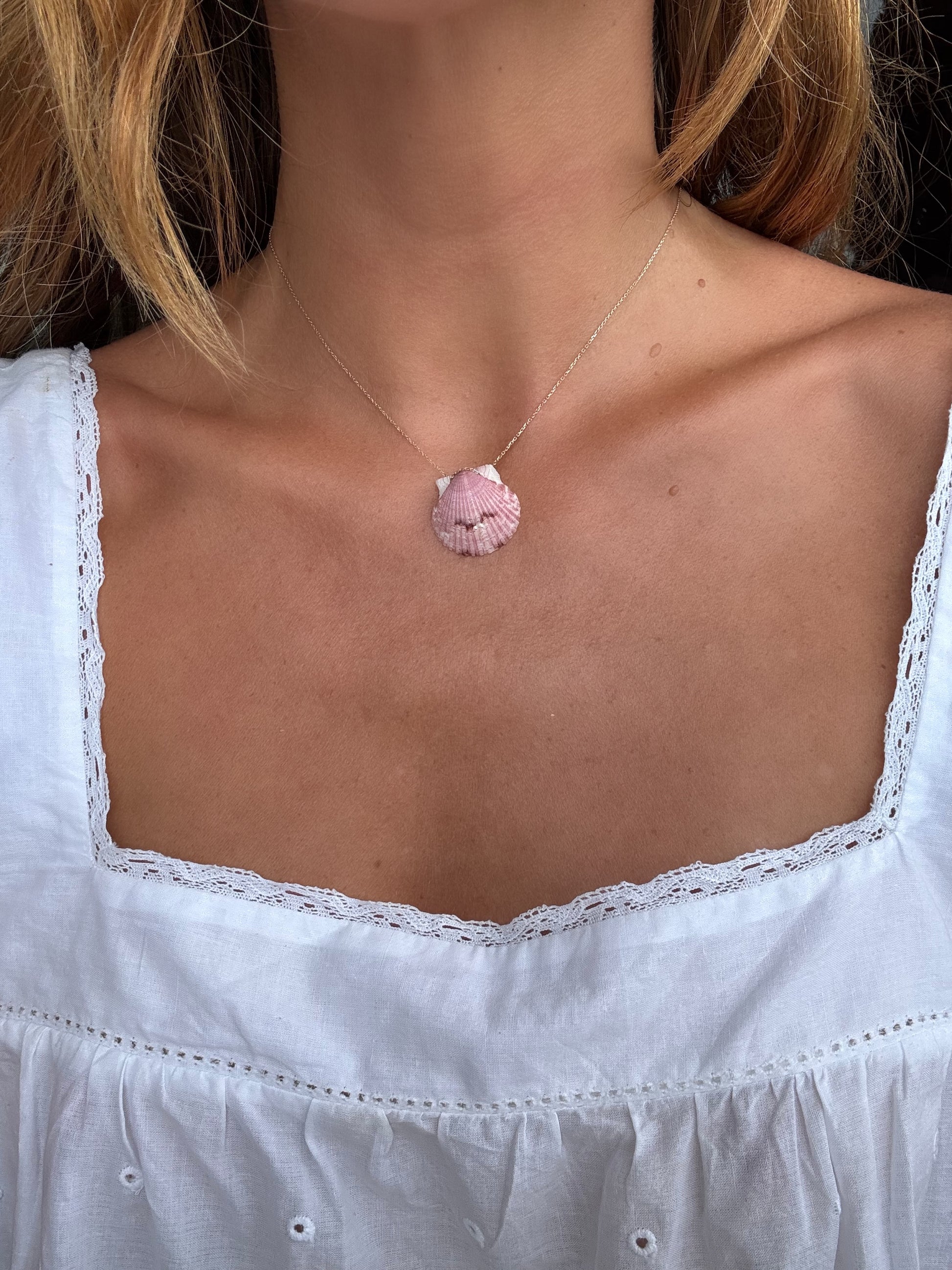 small pink scallop shell on a dainty but solid 14k gold chain.